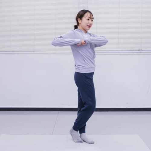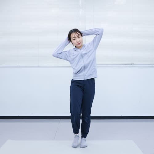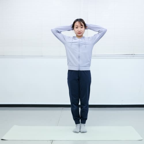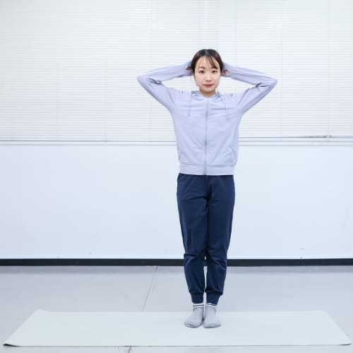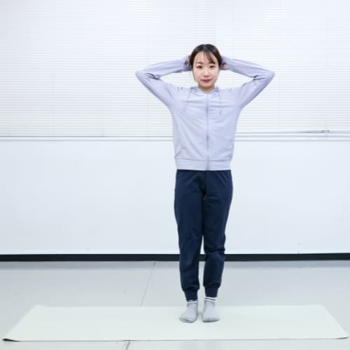 - 足を肩幅に開いて立ち、両手を頭の後ろに添える