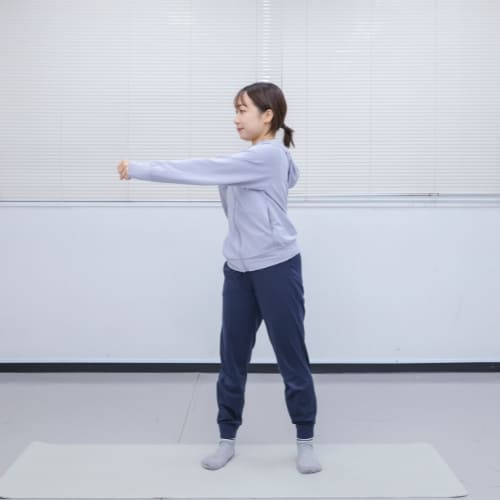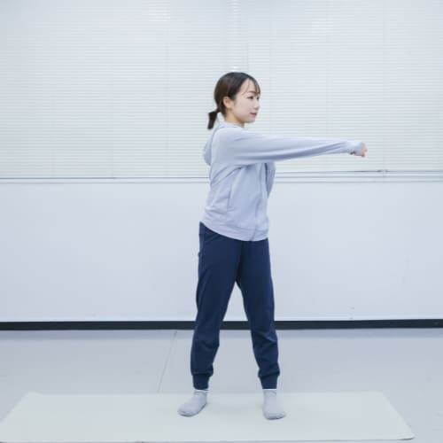 - 肩幅くらいに足を開いて立ち、反対側の手を腰に置く