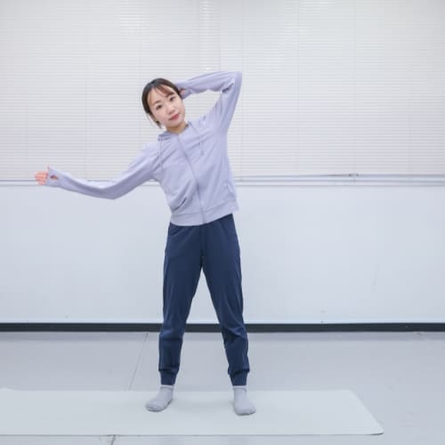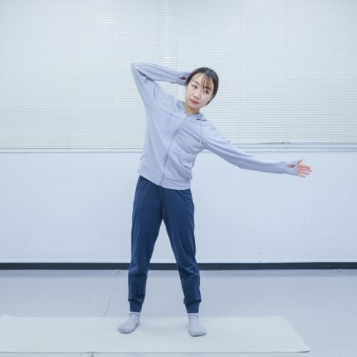動き自体は簡単そうに見えましたが、無意識にひざを曲げてしまっていて、身体を倒しているだけの動きになってしまっていました。ひざを伸ばしたまま、身体を真横に倒すことを意識すると、脇腹が伸び縮みする感覚が得られました。