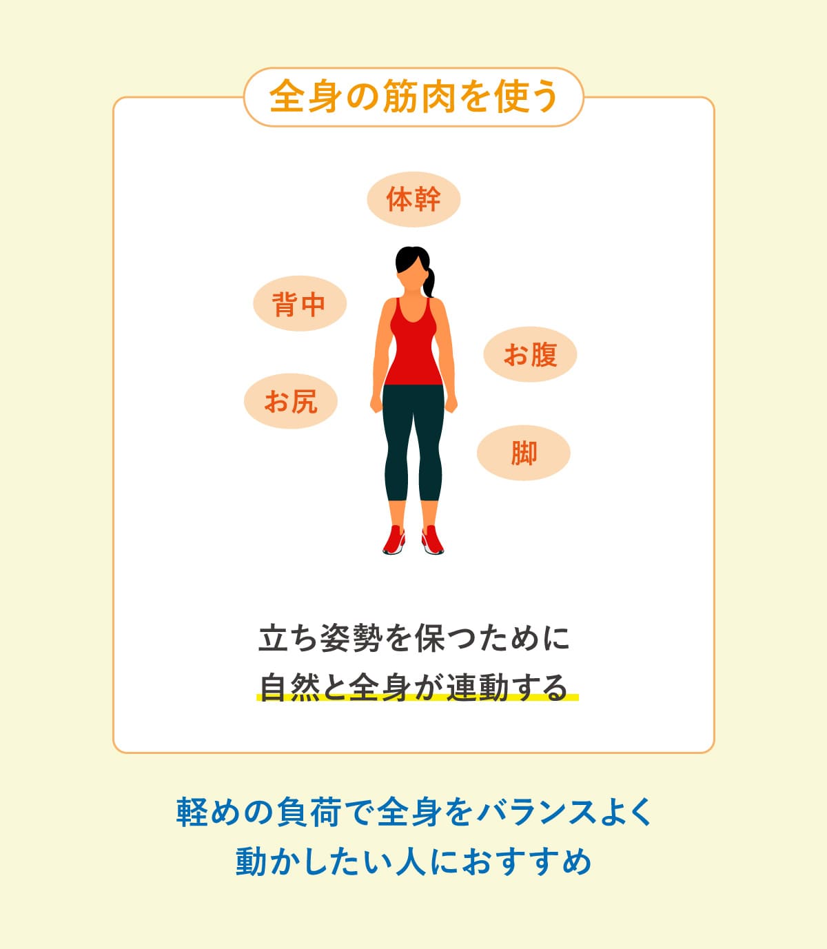 立ち腹筋は立った姿勢のまま動作をおこなうため、お腹だけでなく、姿勢を支えるために背中や脚、お尻、体幹の筋肉も自然と使われる。