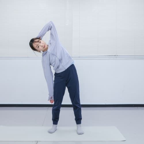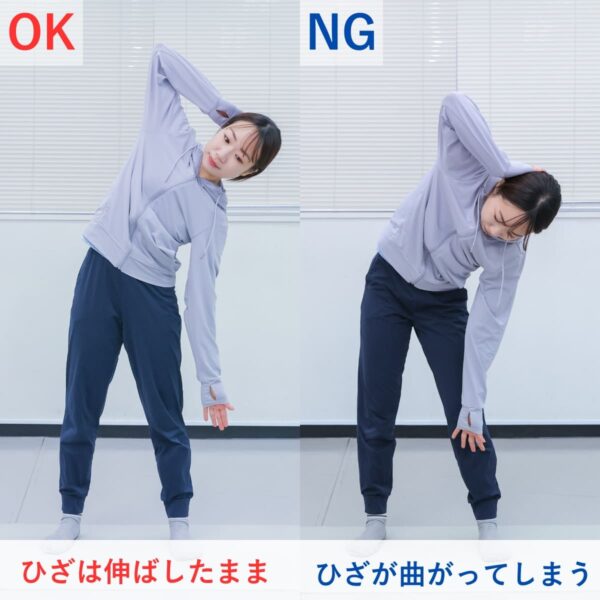 ひざを曲げてしまうと身体が沈み、脇腹への刺激が弱くなります。脚はまっすぐ伸ばし、身体を折るのではなく、横に倒す意識が大切です。ひざを固定することで、脇腹の伸びと縮みがはっきりし、本来の効果を感じやすくなります。