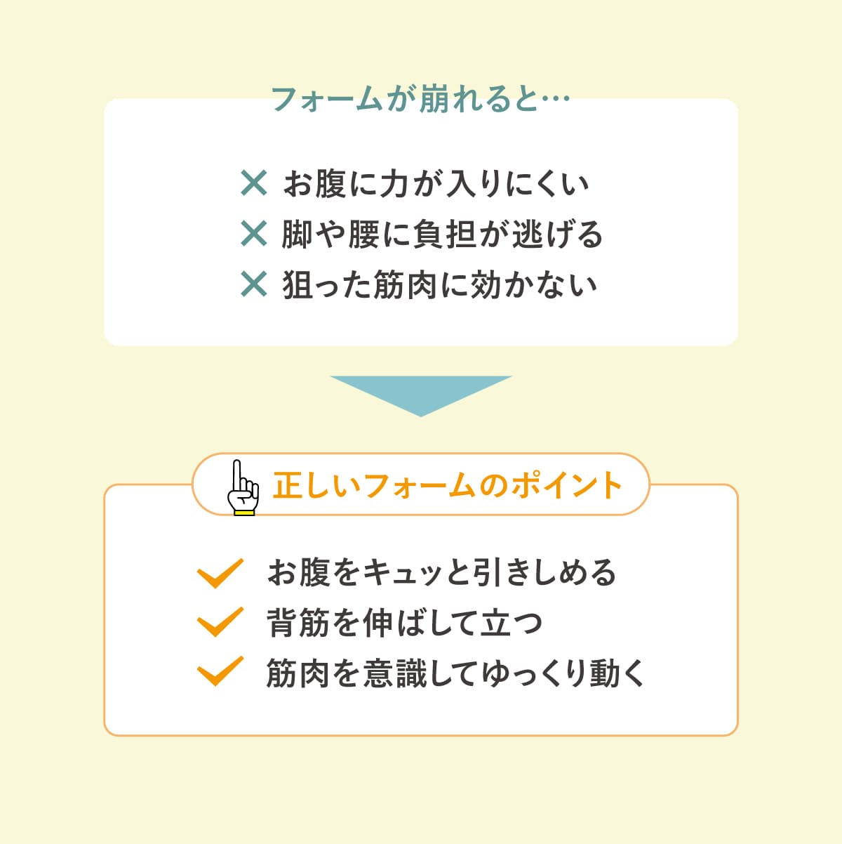 フォームが崩れるとお腹に力が入りにくくなり、狙った筋肉に効きづらくなる。とくに勢いをつけて動いたり、背中が丸まったりすると、力が脚や腰に逃げやすくなる。