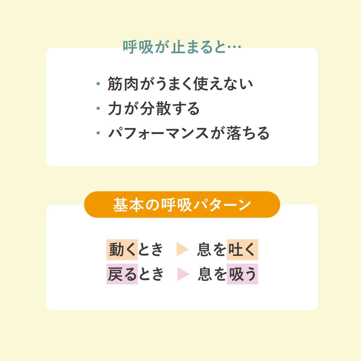 呼吸が止まったままではしっかりと筋肉を使うことができず、十分なパフォーマンスを発揮することができない。