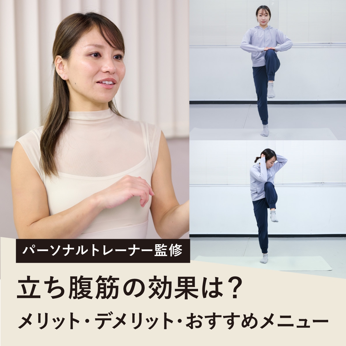 立ち腹筋は、寝たままおこなう腹筋と違い、身体をまっすぐ支えながら動く必要があるため、体幹力も必要です。