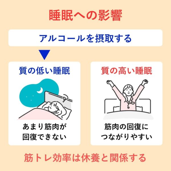 飲酒後は睡眠の深さが損なわれやすく、筋肉回復につながる質の高い睡眠が確保しにくい。睡眠中は筋タンパク質合成やホルモン分泌が活発になるが、アルコールは睡眠構造を乱し、深い睡眠やREM睡眠を減少させることがある。