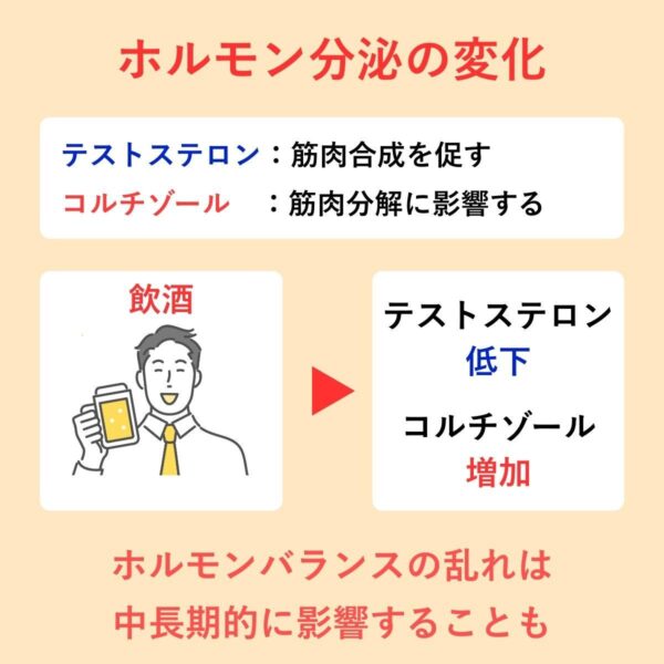 テストステロンは筋肉の合成を促し、筋力や筋量の維持に関わる男性ホルモン。アルコールの摂取によりテストステロンの分泌が低下し、コルチゾール(分解系ホルモン)が増加しやすくなる。
