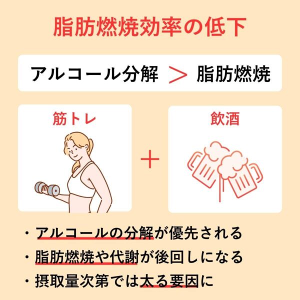 飲酒が脂肪や糖の代謝を後回しにすることで脂肪燃焼を阻害し、脂肪蓄積や減量の効率を下げる。