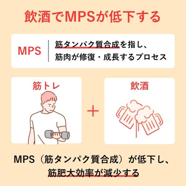 アルコールを摂取すると筋タンパク質合成(MPS)が約24~37%減少する