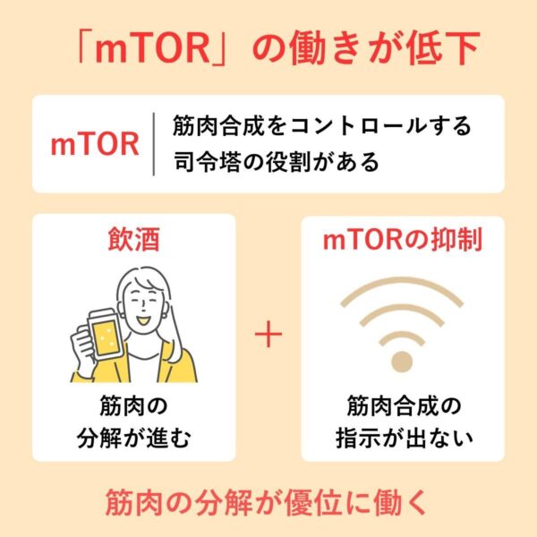 細胞の成長や筋肉の合成をコントロールする司令塔「mTOR(エムトール)」の働きがアルコール摂取後には抑えられ、筋タンパク質合成が十分に進まない状態になりやすい。