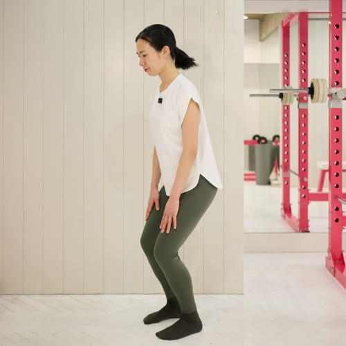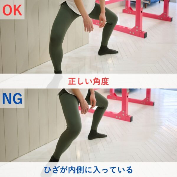 つま先とひざの向きがそろっていない状態でおこなうと、ひざが内側へ入りやすくなり、ひざ関節へ負担がかかりやすいと感じました。