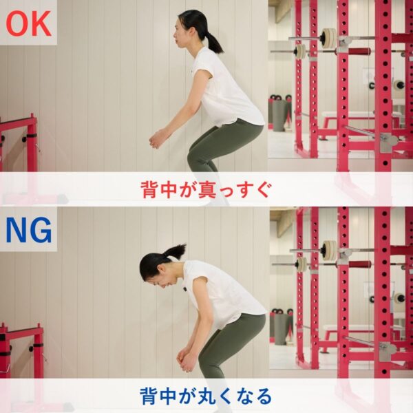- 背中と腰を一直線に保ち、腰をゆっくり下げる