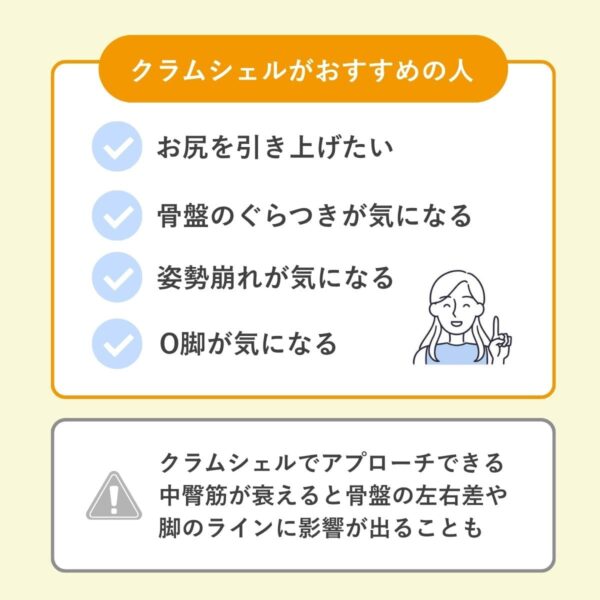 クラムシェルはお尻の上部から側面に位置する中臀筋を効率的に刺激し筋肥大を促すことで、ヒップラインに丸みを生み出し、ヒップのたるみや横に広がった印象の改善、美尻形成に効果が期待できる。
