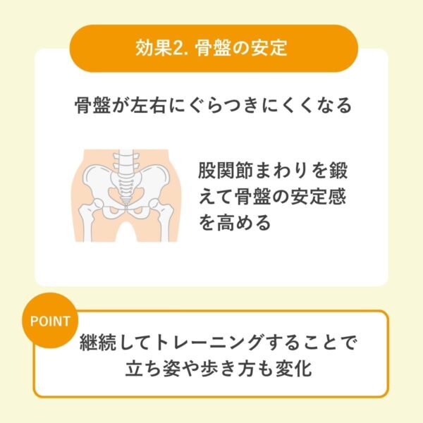 | 機能改善 | 骨盤の安定性が高まり、歩行や片脚動作のバランスを保ちやすくなる |