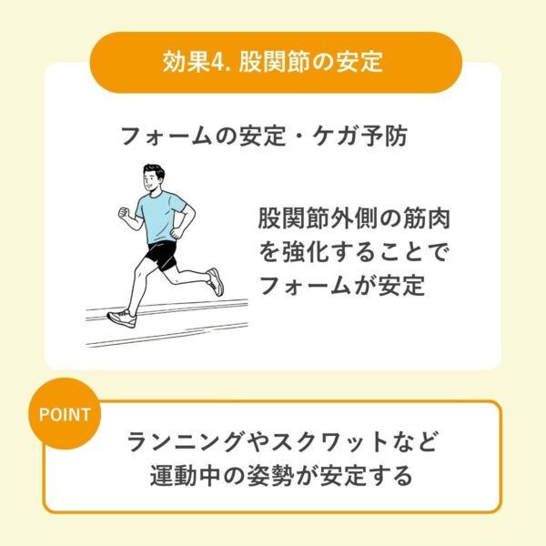 | 機能改善 | 股関節の安定性が高まり、脚の動きをコントロールしやすくなる |