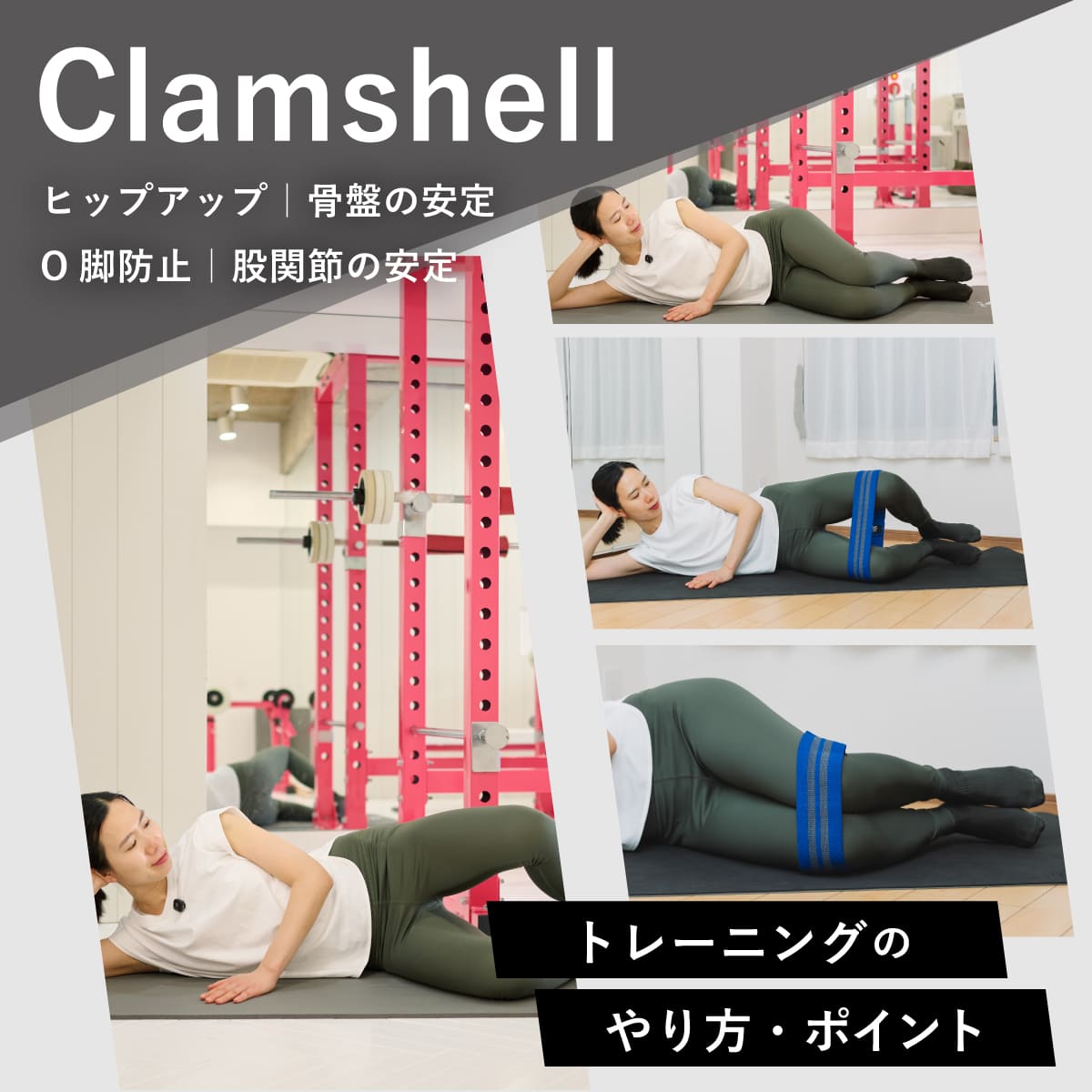 ここでは、クラムシェルと一緒におこないたいヒップアップトレーニングを紹介。