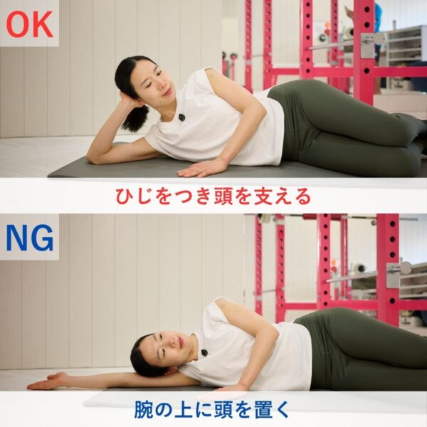 横向き姿勢で骨盤が後ろへ倒れると、股関節ではなく体幹の回旋動作になりやすい。見た目は大きく動いていても、お尻の筋肉の収縮は弱くなりやすい。