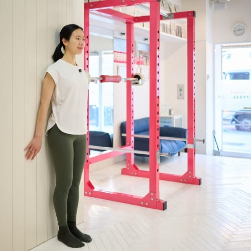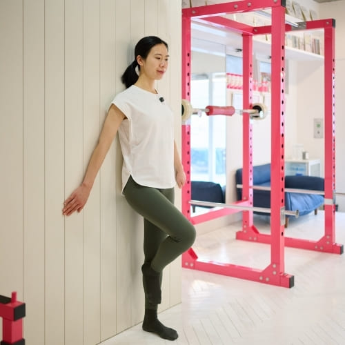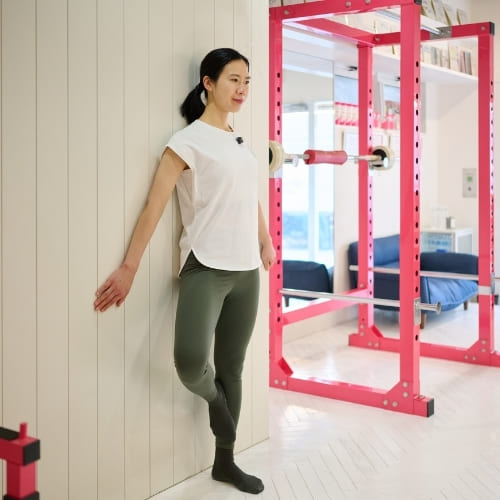 姿勢が安定していないと内ももなど別の筋肉が働きやすくなるため、まずは壁を使ってフォームを安定させることが大切です。