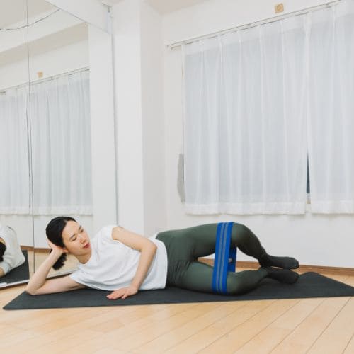 バンドを使ったクラムシェルは、中殿筋や小殿筋への負荷を高めるためのバリエーションです。バンドの張力が常に外側へ引っ張る力として働くため、ひざを開く動作でお尻の筋肉をより使いやすくなります。