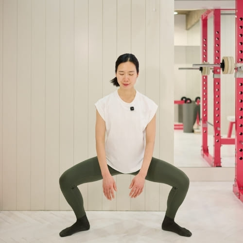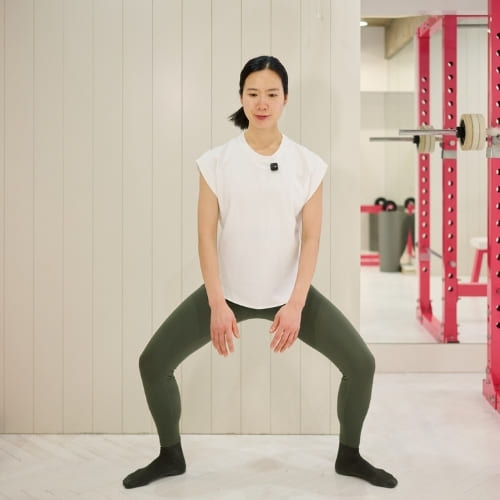 ワイドスクワットでは、かかとに重心を乗せるイメージを持つと股関節を使いやすくなり、お尻や内ももへの刺激を感じやすくなります。