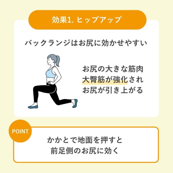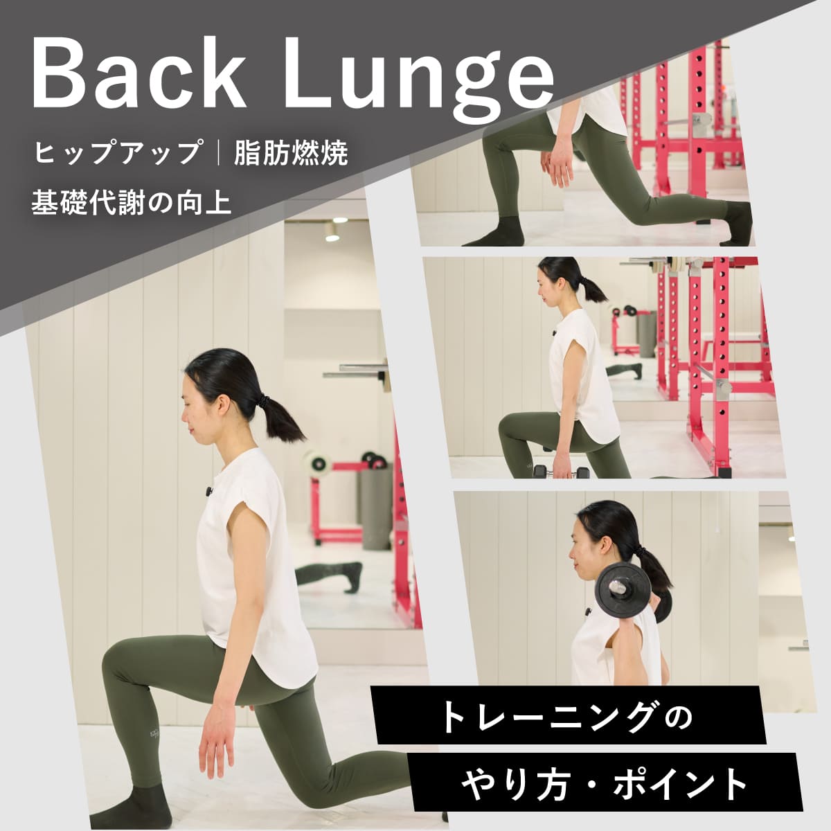バックランジは、前脚で床を押しながら立ち上がる動きで大臀筋を使いやすく、ヒップアップを狙う種目として使いやすい。
