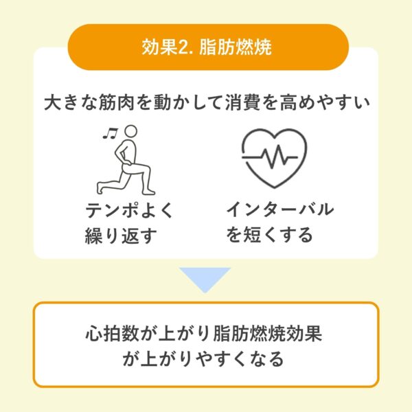 テンポよく回数を重ねる・インターバルを短くする・他の自重種目と組み合わせることで、心拍数が上がり脂肪燃焼効果も高くなりやすい。