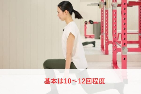 無理に回数を増やすとフォームが浅くなるため、同じ深さで動作できる回数を基準にした方がよさそうです。運動習慣のある人だと、自重での10~12回は負荷が軽く感じるかもしれません。