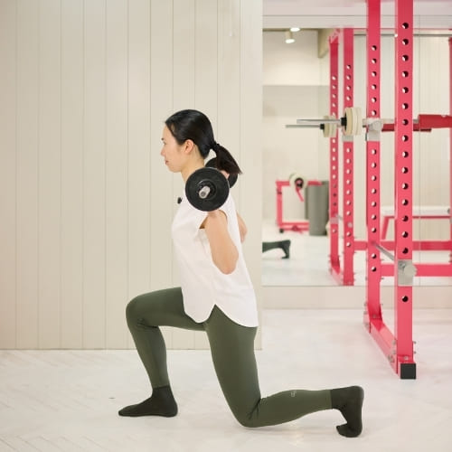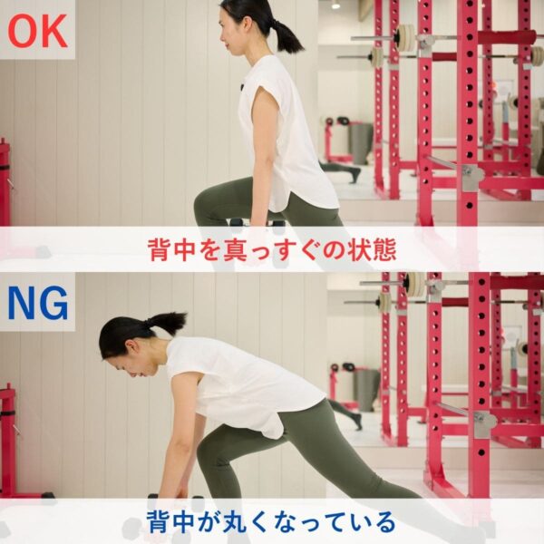 また、バックランジはスタート位置に戻るときに前脚で床を押しやすく、お尻ともも裏を意識しやすいのも特徴。