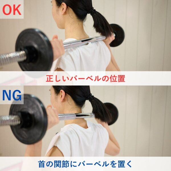 バーベルの位置を首の関節あたりに置いてしまうと、担いだときに首まわりに圧迫感が出て姿勢も不安定に感じました。