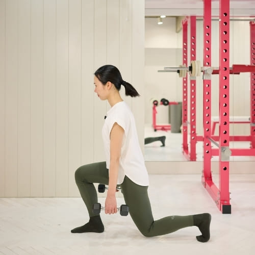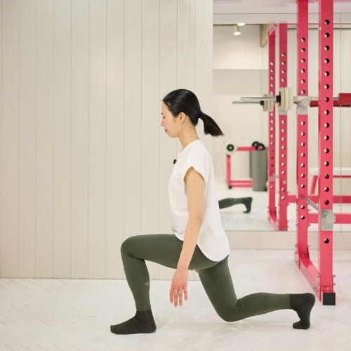 腰を落とすときは、前脚のひざが約90度になる程度を目安にすると可動域を確保しやすくなります。深さよりも、同じ位置まで安定して腰を落とせることを意識するとフォームが整いやすくなります。