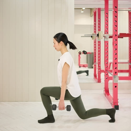 バックランジは比較的シンプルな動作ですが、前脚で身体を支える時間が長いため、バランスを保ちながらていねいに動くことが大切です。動作が安定してくると、お尻やもも裏にも刺激が入りやすくなります。