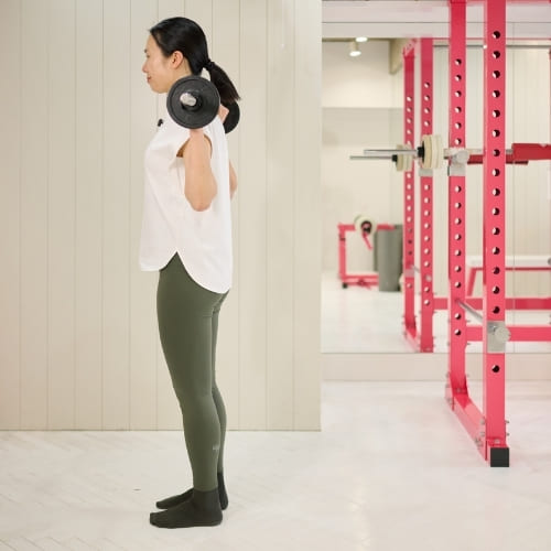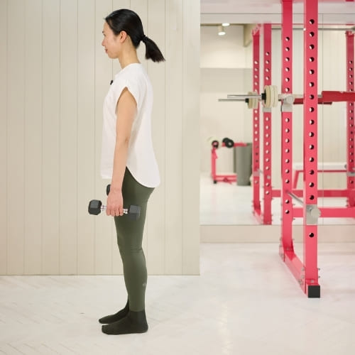ダンベルは身体の横に自然に下げた位置で持つのが基本です。前後に振るように動かすのではなく、ダンベルを身体の真下へ落とすイメージで上下すると姿勢が安定しやすくなります。