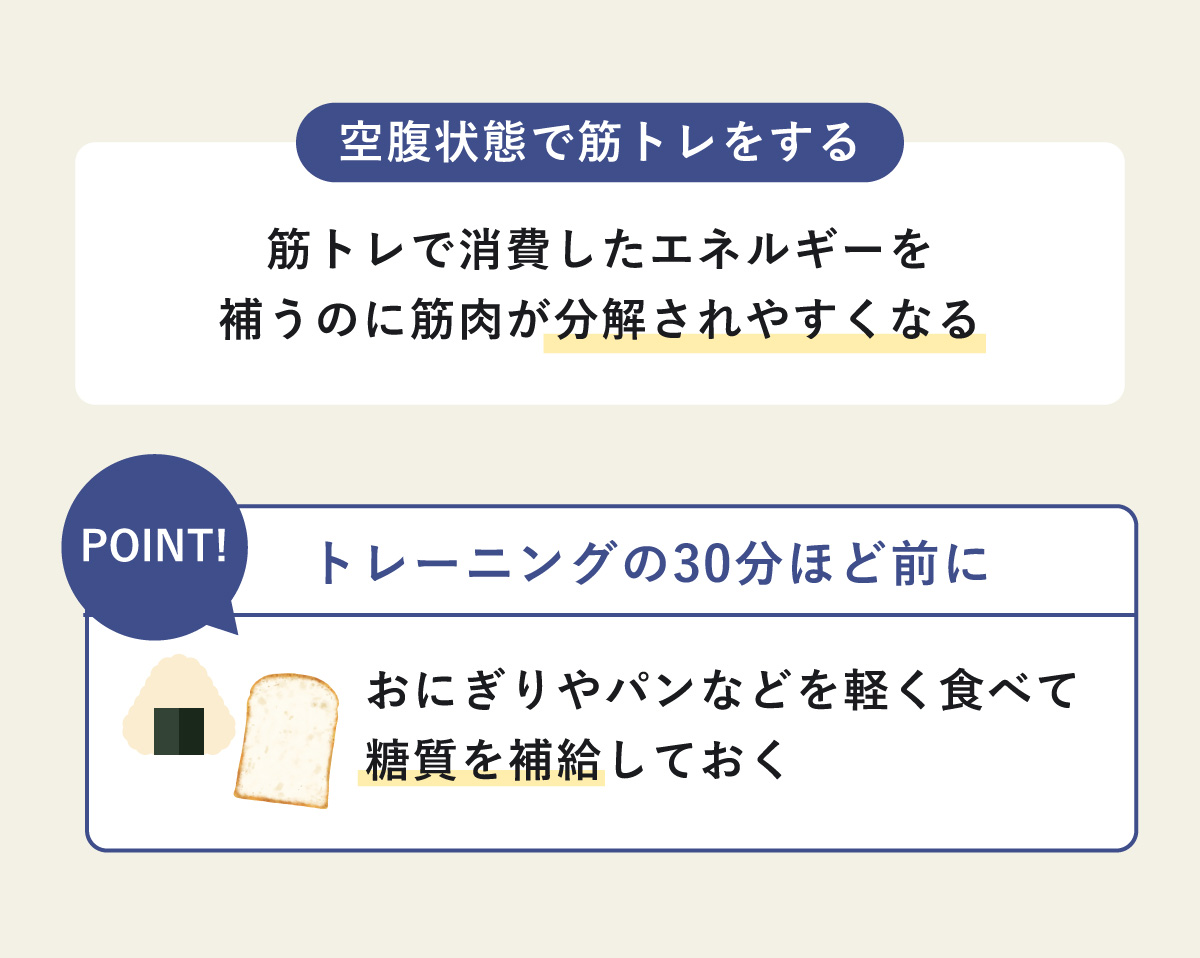 そのため、トレーニング前におにぎりやパンなどを軽く食べて、糖質を補給しておくようにしよう。
