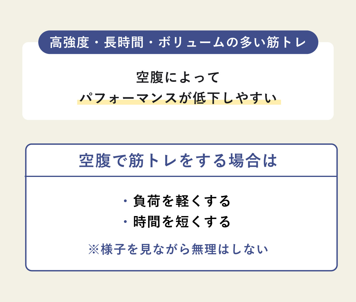 空腹時は利用しやすいエネルギーが少ないため、高強度の筋トレではエネルギー不足になりやすく、筋たんぱくの分解が進みやすい方向に傾く可能性がある。
