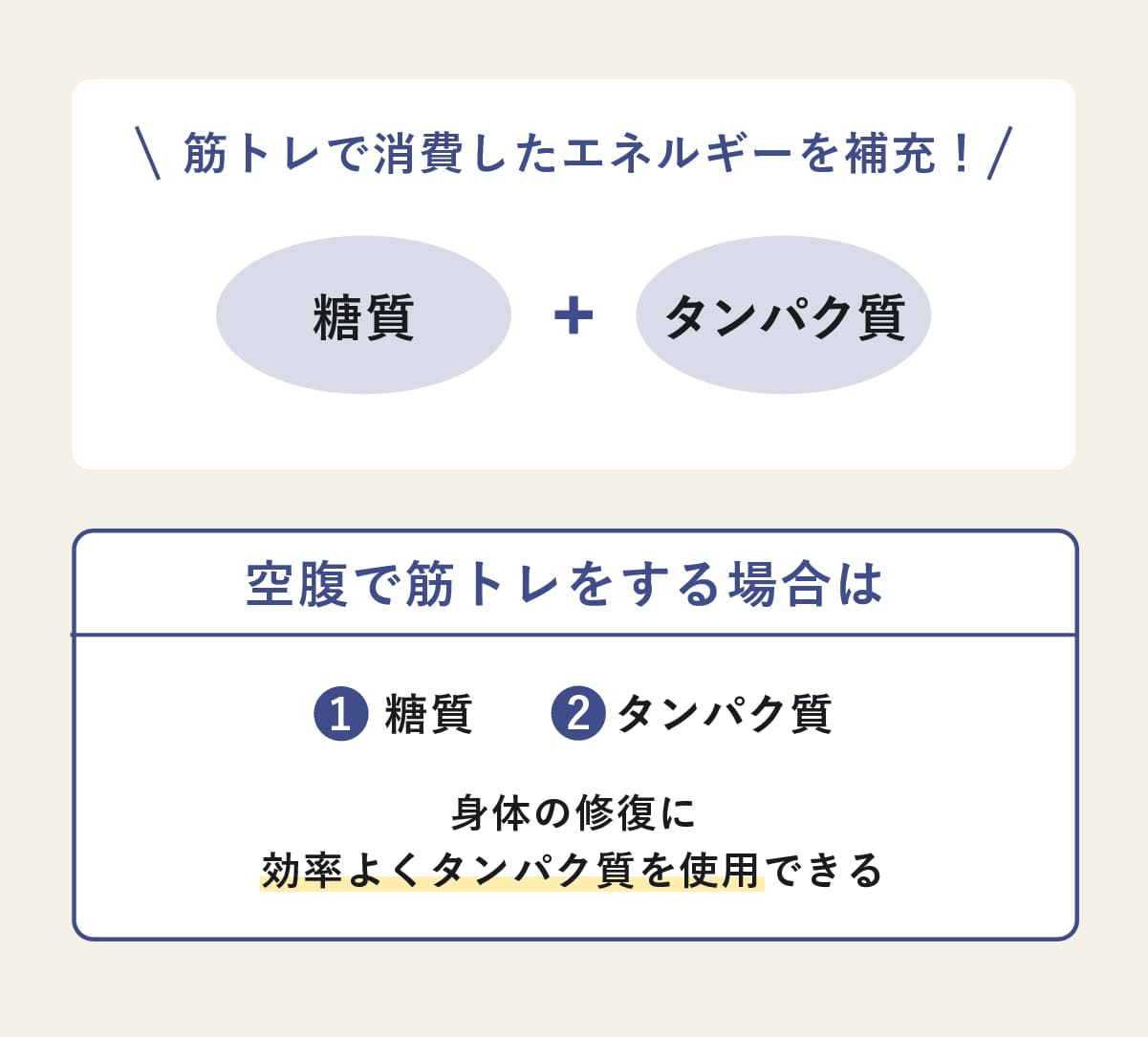 また、トレーニングのエネルギー源となる糖質が不足していると、せっかく摂ったタンパク質がエネルギー補填に回されてしまい、筋肉の合成に使われにくくなる。