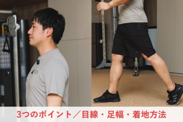 正しいフォームの基本は、目線を上げて遠くを見ること。下を向くと背中が丸まり、足が上がりづらくなるため注意が必要。また、着地の際は過剰に「かかと」を意識しすぎず、足裏全体でフラットに地面を捉えるのがポイント。