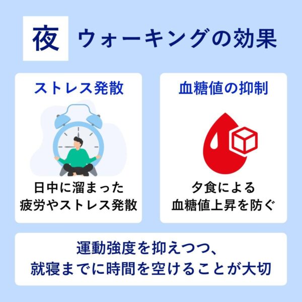 夜の場合も、夕食前(空腹時)なら脂肪燃焼、夕食後なら血糖値コントロールのメリットがあります。