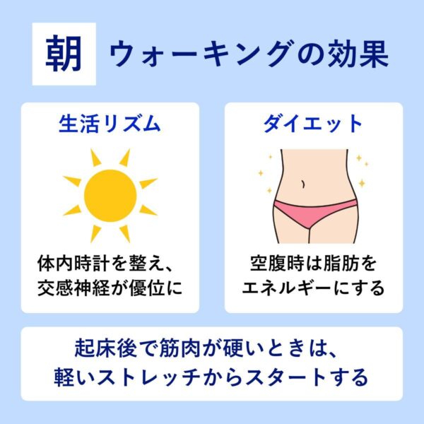 朝のウォーキングは、体内時計を整え、生活リズムの改善につながりやすい時間帯。