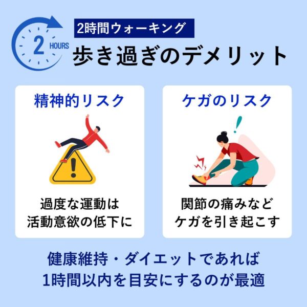 - 歩き過ぎは要注意!2時間以上は逆効果に?