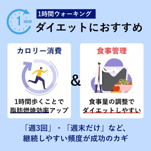 1時間のウォーキングは、脂肪燃焼効率が高まり、十分な消費カロリーを確保しやすい時間設定。