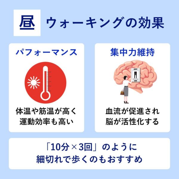 昼間のウォーキングは体温や筋温がすでに上昇しており、運動パフォーマンスを発揮しやすい時間帯。