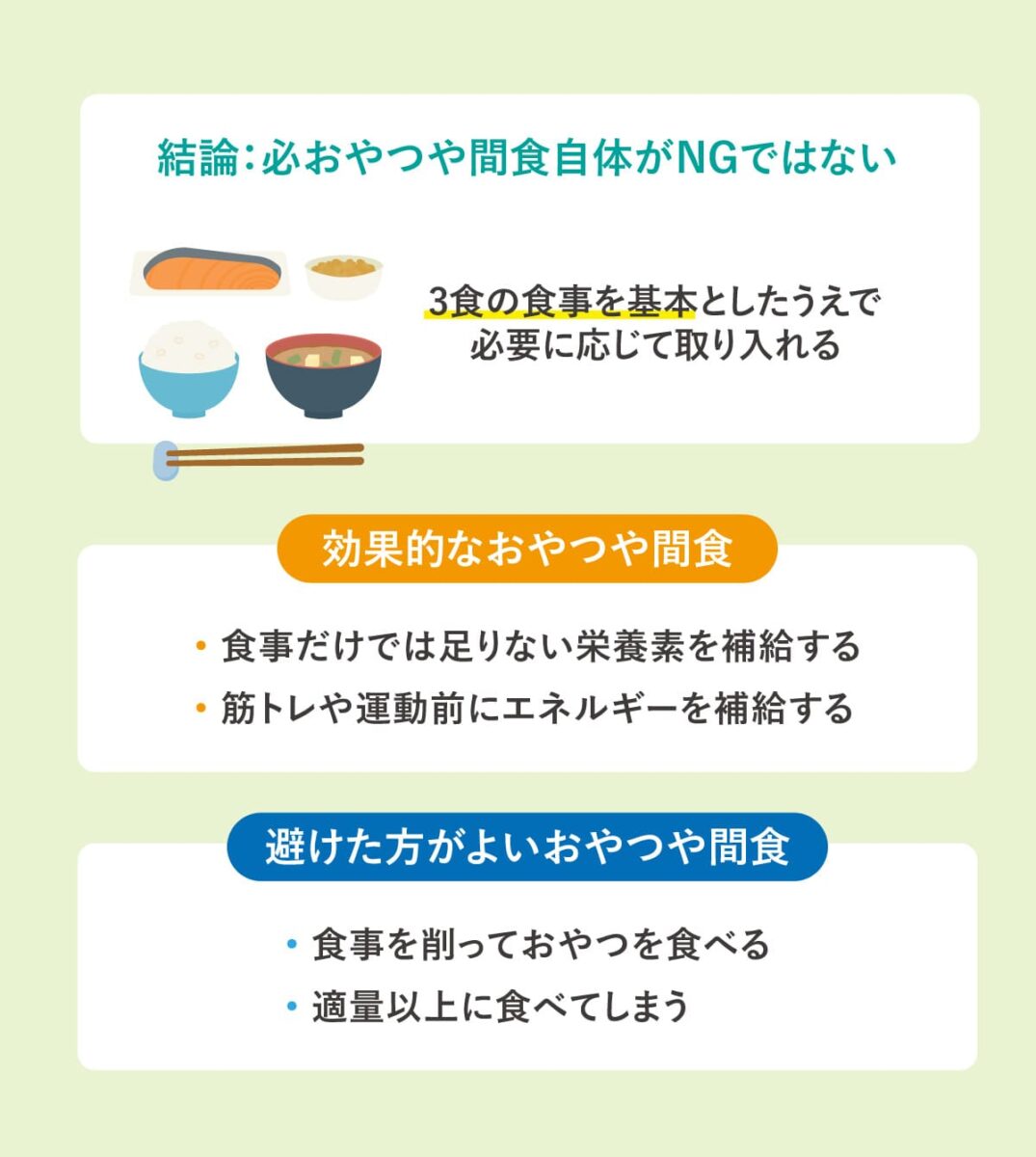 どのような食事や運動をしているかにもよりますが、2食しっかりバランスよく食べられている場合は、無理に間食を取り入れる必要はありません。