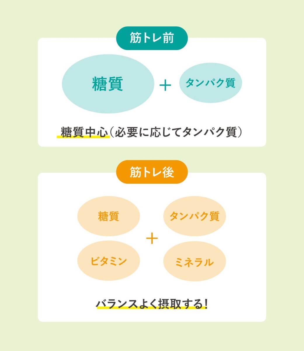 - 筋トレ前後は糖質やタンパク質を補給する