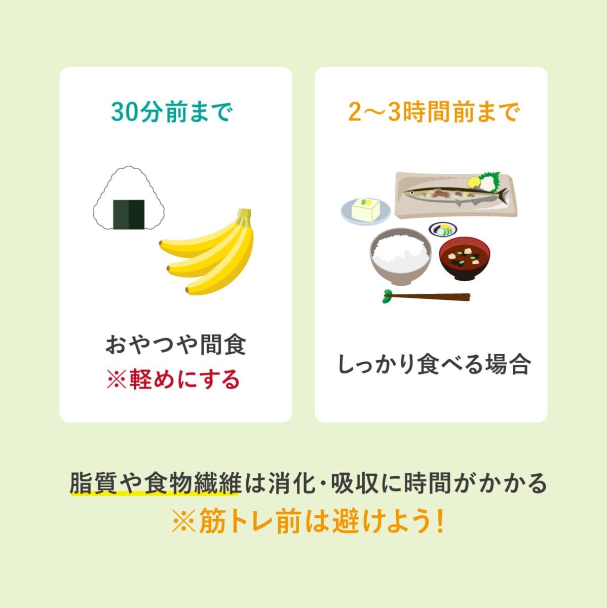脂質や食物繊維は消化・吸収に時間がかかるので、筋トレ前は避けるようにしましょう。