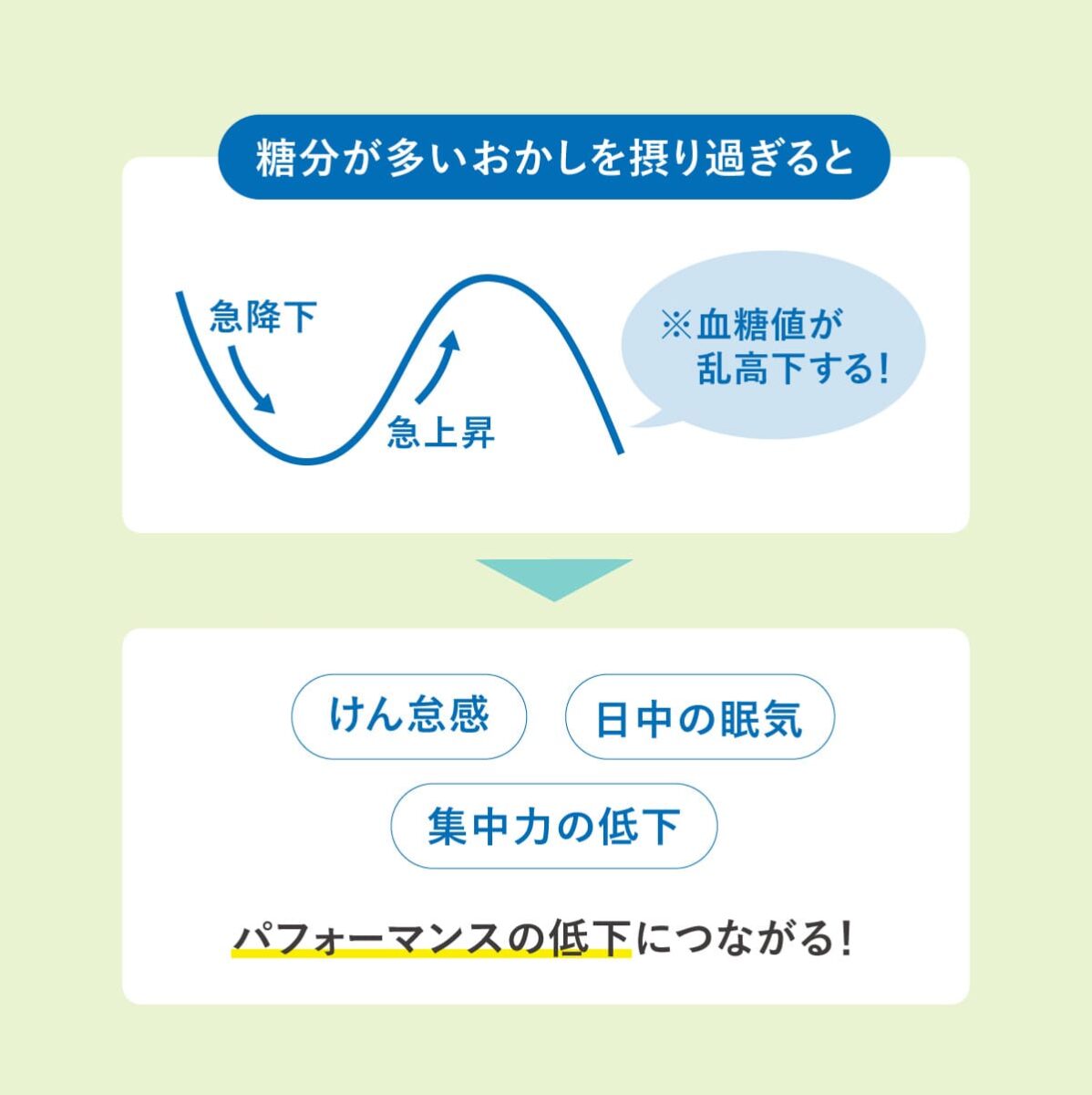 糖分が多いおかしを摂り過ぎると血糖値の乱高下によって、けん怠感や集中力の低下を引き起こす可能性もあるので、注意が必要。