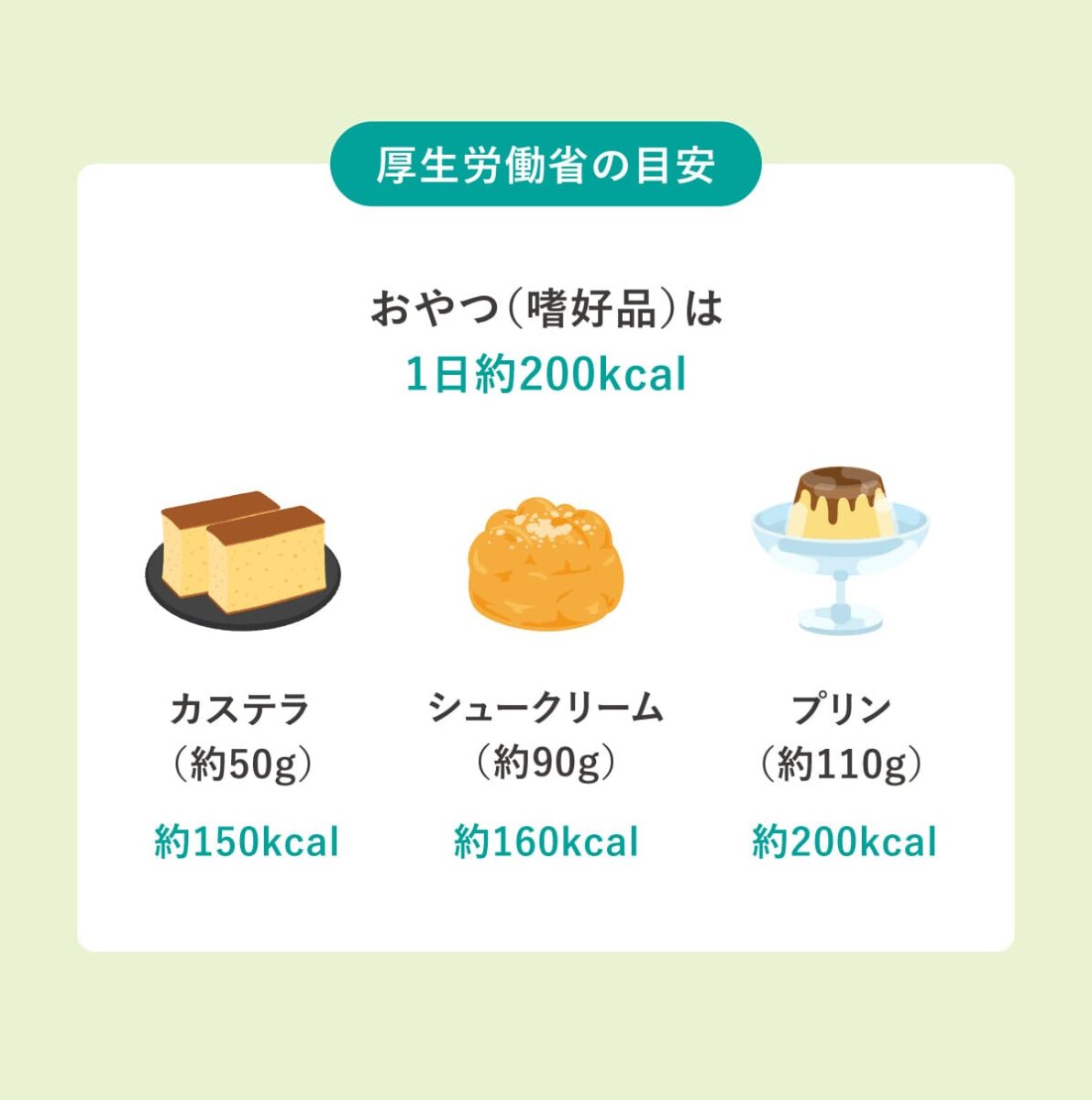 どれくらいが適量かは性別・年代・運動量などによって異なるが、厚生労働省の目安としては、おやつ(嗜好品)は1日約200kcalとなっている。