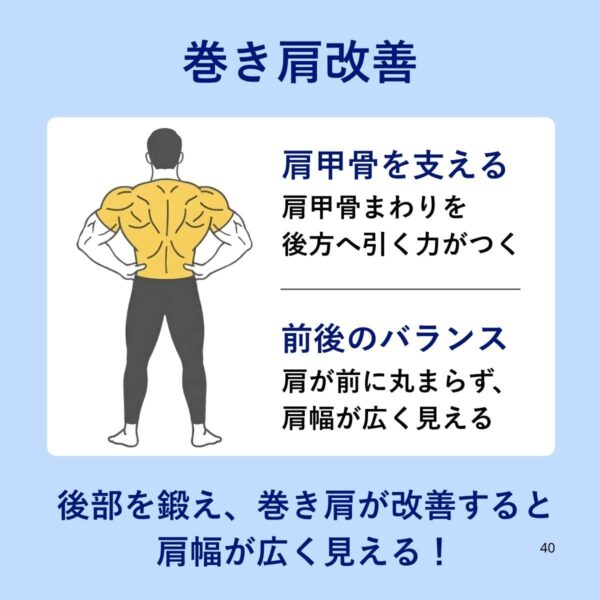 三角筋後部の筋肥大が進むと、肩の後面に丸みが生まれやすく、横から見た肩の厚みが増えやすい。