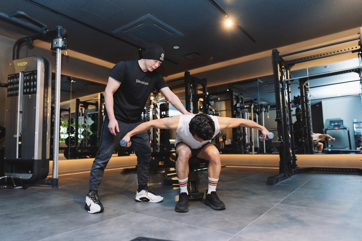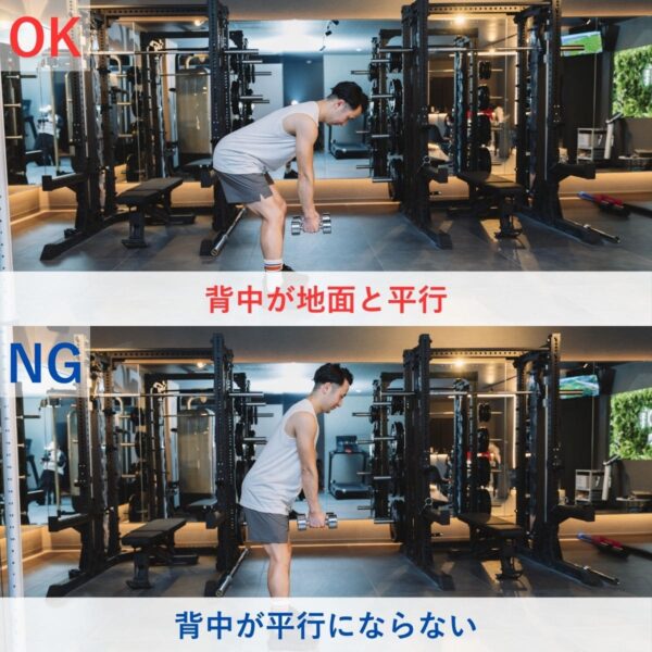 前傾姿勢をつくる段階が意外と難しく、背中が地面と平行に近い状態を保てないと、肩の後ろではなく横(三角筋中部)に負荷が逃げる感覚がありました。また、首を反らして前を見ると肩に余計な力が入りやすいので、目線を床付近に置くと姿勢が安定しやすくなりました。
