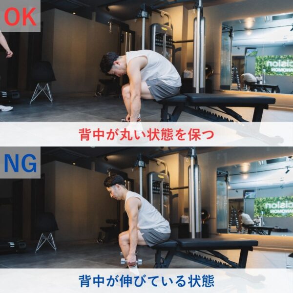 ※1:続けやすさ = トレーニングができる場所の自由度/器具や設備の必要性 ※2:トレーニング効率 = 複数部位にアプローチできるか/負荷調整できるか 【やり方】 監修者:関根 シーテッドリアレイズは、ベンチや椅子に座っておこなうリアレイズのバリエーション。前傾姿勢の角度を保ちやすく、上半身も安定しやすいため初心者におすすめです。 動作の際は上体を丸めることで、三角筋後部に刺激が入りやすくなります。 【注意点】 検証者:山本 リアレイズで「背中を丸める感覚」を意識するのが、最初は難しかったです。背中を伸ばしたままだと背中の筋肉が働きやすく、三角筋後部への刺激が弱くなる印象があります。 軽く猫背をつくるような感覚で姿勢を保つと、肩の後ろ側に刺激が入りやすく感じました。 監修者:関根 スタンディングリアレイズの場合は上体を起こしたくなりますが、シーテッドリアレイズだと姿勢を保ちやすくなります。 重い重量を扱うよりも、軽めの負荷でコントロールしながら反復することで、三角筋後部へ安定した刺激を与えやすくなります。シーテッドリアレイズ