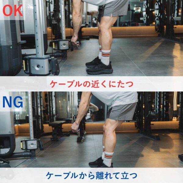 ※1:続けやすさ = トレーニングができる場所の自由度/器具や設備の必要性 ※2:トレーニング効率 = 複数部位にアプローチできるか/負荷調整できるか 【やり方】 監修者:関根 ケーブルリアレイズは、ダンベルと比べてテンションが一定にかかるため、筋肉の収縮と伸張を意識しながら動作をおこないやすくなります。ケーブルの位置は低めに設定し、腕で引くのではなく「ひじを外へ導く」イメージで動かすことがポイントです。 ケーブルの近くに立つ 検証者:山本 ケーブルから離れて立つと、腕を大きく振る動きになりやすく、三角筋後部にうまく刺激が入らない感覚がありました。ケーブルの近くに立ち、ひじを外へ引く動きを意識すると肩の後ろ側に効きやすく感じます。 監修者:関根 ケーブルリアレイズはテンションが抜けにくい反面、フォームが少し崩れるだけでも刺激が背中や腕に逃げやすい種目です。そのため、重量を上げるよりも動作のテンポや軌道を安定させることが重要になります。 種目として難易度は高いため、最初は一番軽い重量から始め、三角筋後部の収縮を確認しながらコントロールして動作をおこなうことが大切です。ケーブルリアレイズ