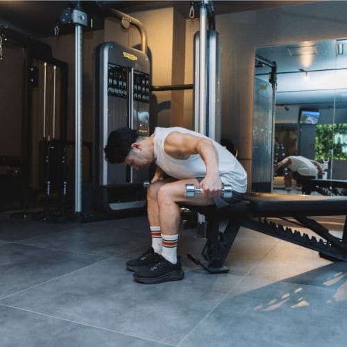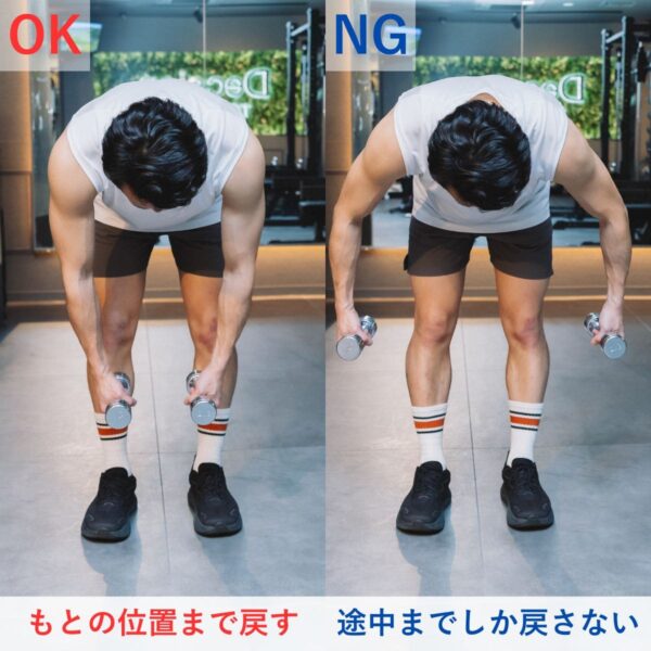 リアレイズではダンベルをしっかり下ろして可動域を広く使うことが重要です。途中で止めてしまうと三角筋後部の伸張が不足し、トレーニング効果が下がりやすくなります。また、一定のテンポで連続して動作を繰り返すことで、三角筋後部へ安定して刺激を与えやすくなります。